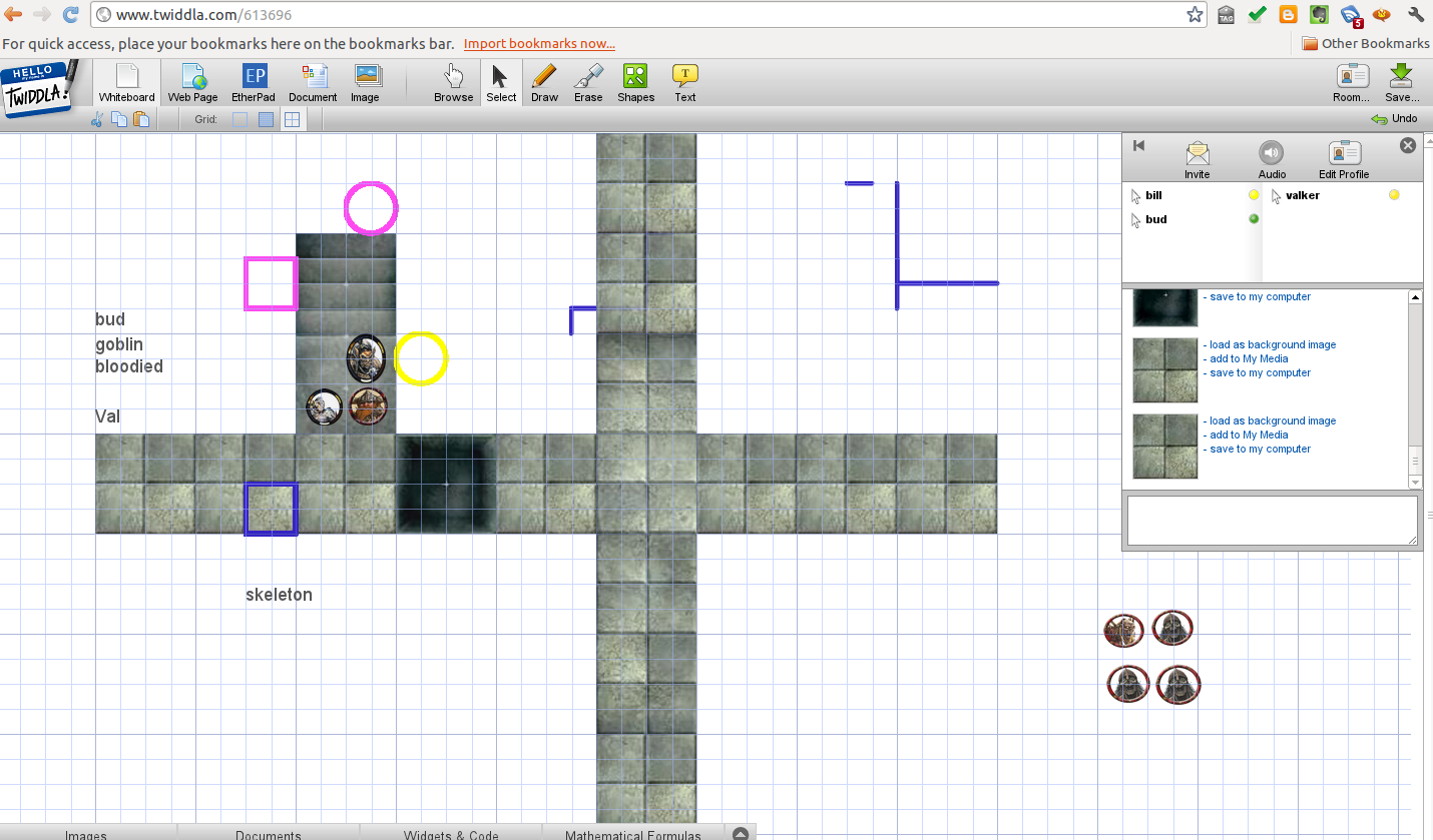 Twiddla worked great, although we had a couple of hiccups.  If you use tiles, you need to make sure you put the tiles to the back, so that the tokens for each player doesn’t get hidden.  The second is when we had multiple lines, tiles and PC tokens on the same space it became a little tricky to select the right piece.  But otherwise, it was a lot of fun, and easy to use.  I’ve got some more pointers on how to use it, and I’ll be posting it tomorrow.
