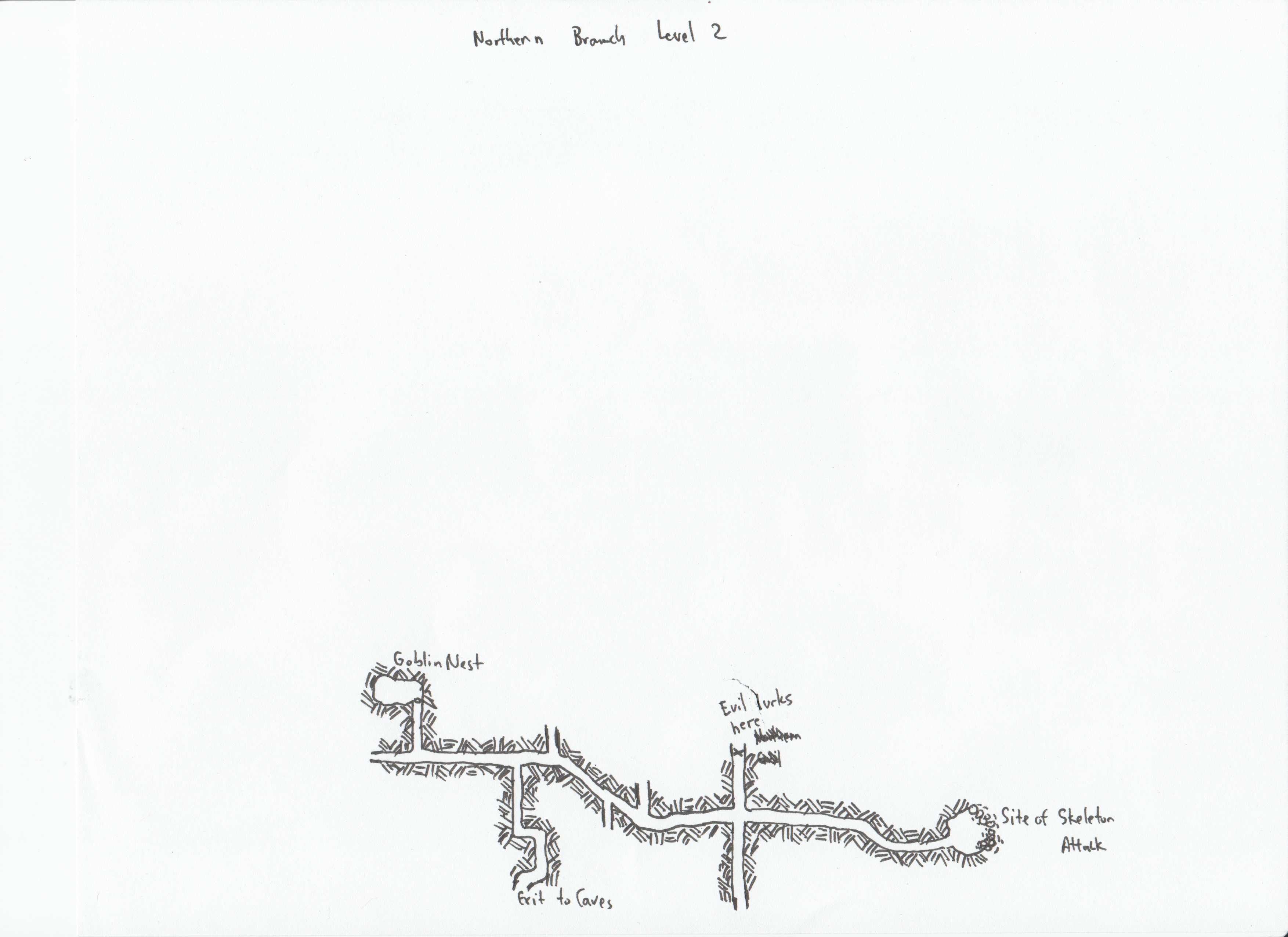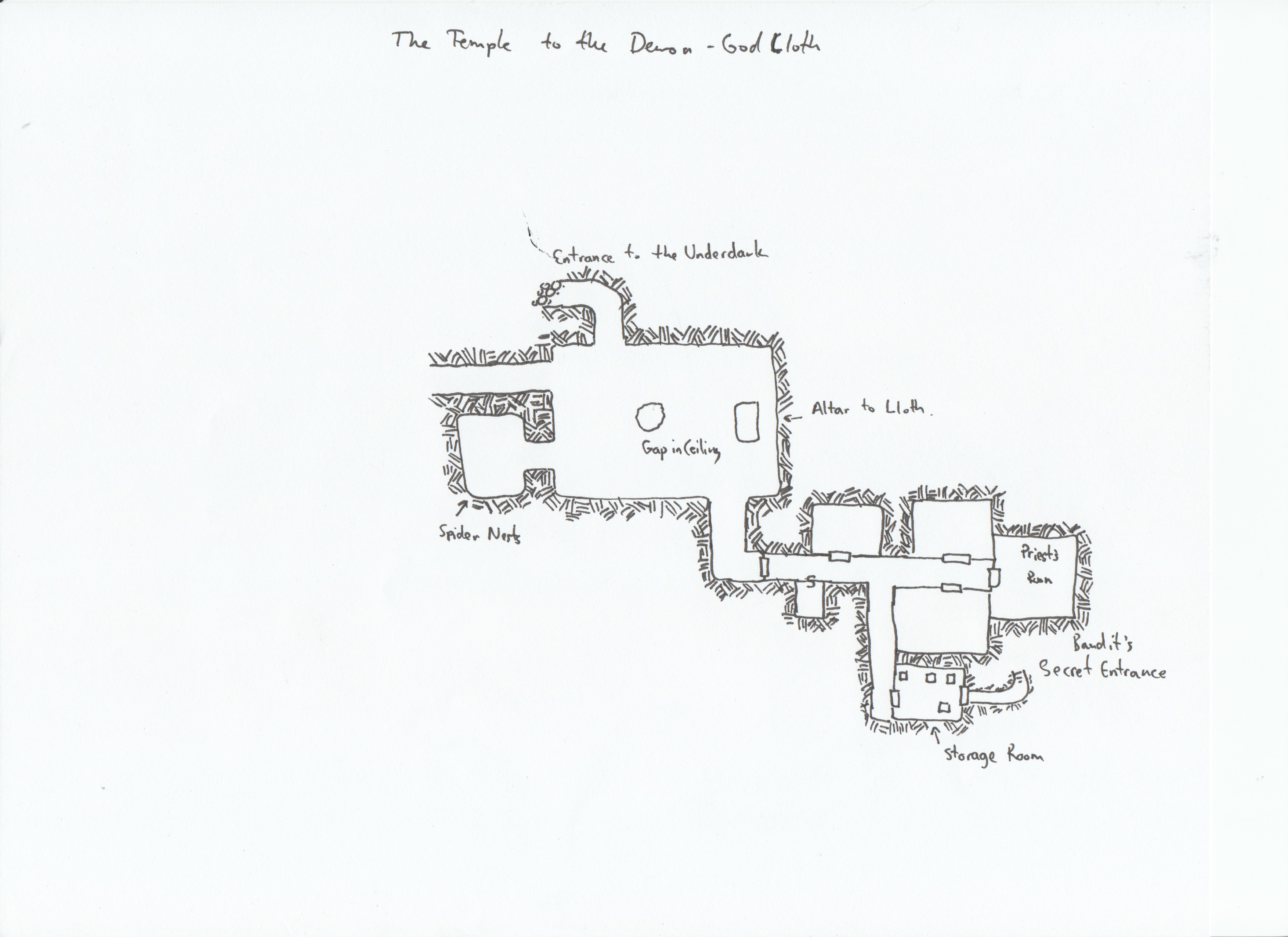 The second map is of the temple of Lloth that they found buried in the woods. Of course, after the adventure this week, the map has been radically altered. They dropped the roof on a nest of spiders collapsing half of the main altar room.